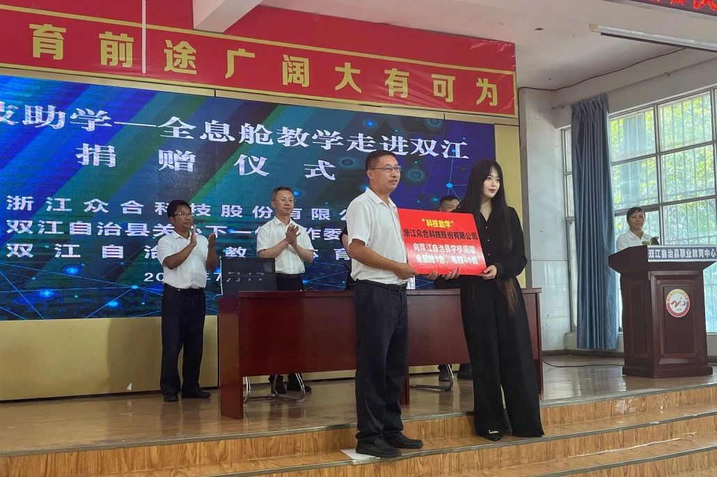 7月初,當臨滄市委書記杜建輝率團考察眾合科技時,雙江自治縣便與眾合科技達成了戰略合作,雙方約定在科技助學、科技助農、自然資源保護開發及茶產業數字化等領域展開深度合作。基于這一合作共識,今日,云南省臨滄市雙江自治縣職業教育中心報告廳內,“AI科技助學——全息艙教學走進雙江”捐贈儀式溫暖啟幕。這不僅是眾合科技ESG行動計劃的又一次重要實踐,更為雙江自治縣的教育與農業發展注入了新的科技動能。